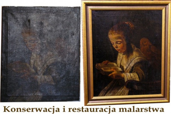 Wykonujemy konserwacje i renowacje malarstwa sztalugowego (obrazy olejne na płótnie i na desce). Przeprowadzamy renowację starych krosien, cały szereg prac i badań dotyczący stanu obrazu i konserwacji podłoża, zaprawy i warstwy malarskiej, naprawiamy również na życzenie klienta stare ramy. Dodatkowo świadczymy takie usługi jak politurowanie, woskowanie, złocenie antyków.